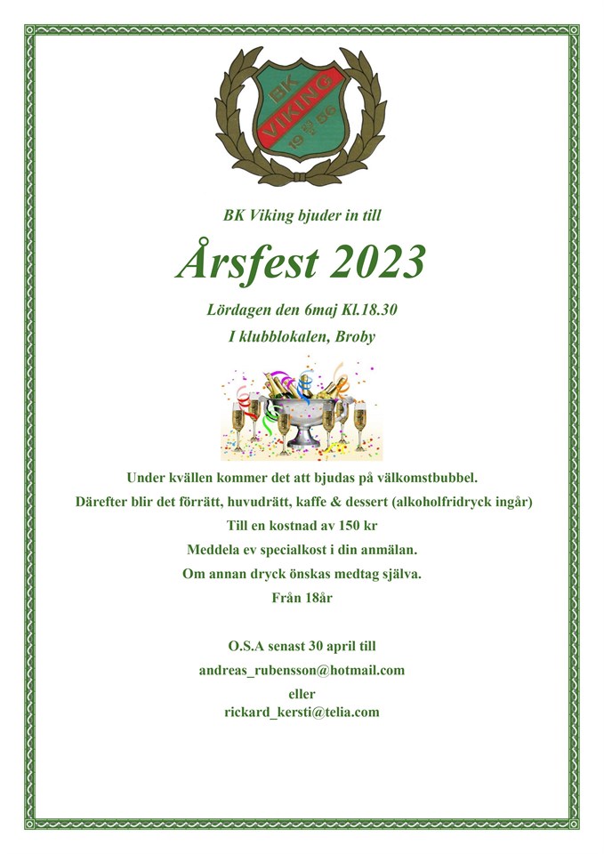 BK Viking bjuder in till årsfest den 6/5! Sista anmälningsdagen är nu på söndag 30/4 Ser fram emot en trevlig kväll tillsammans, hoppas vi ses! // Festkommittèn BK Viking 26 apr 2023 0kommentarer